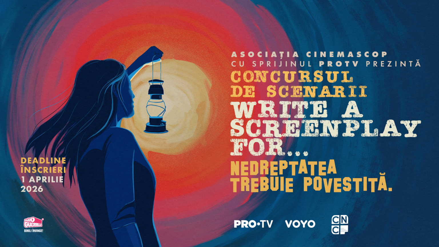 Într-o lume tot mai divizată ideologic, polarizată în jurul unor idei care nu servesc mereu binele colectiv, adevărul se poate pierde cu ușurință în atâta zgomot. În acest context, dăm startul unei noi ediții WRITE A SCREENPLAY FOR… – concursul de scenarii și pitch-uri care transformă ideile puternice în filme și seriale cu impact. Asociația Cinemascop, cu sprijinul PRO TV, lansează ediția a VIII-a a competiției dedicate noii generații de creatori de scenarii. Tema din 2026 este una puternică și necesară: „NEDREPTATEA TREBUIE POVESTITĂ”. Căutăm povești curajoase despre nedreptate – personală, socială, istorică sau contemporană – care pot deveni miniserii TV sau lungmetraje cu forță reală. Dacă ai o poveste care poate îmbogăți perspective, emoționa sau provoca dezbatere, acum este momentul să o aduci în față. Scrie. Propune. Fii o voce care nu poate fi ignorată.