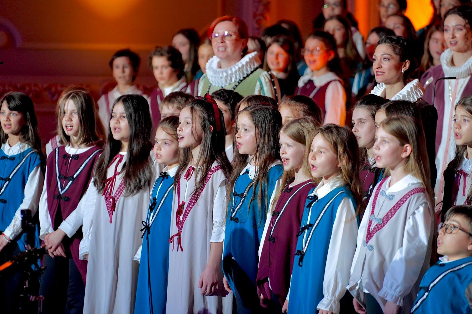 Corul Madrigal a deschis gala alături de 130 de copii din corurile Cantus Mundi, cu emblematicul madrigal italian „Vezzosette nimphe e belle”, de Giovanni Gastoldi – imnul neoficial al Madrigalului.